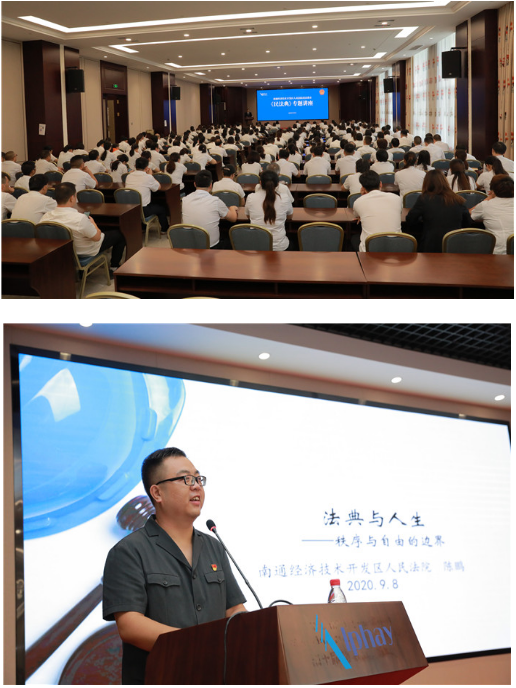 签约仪式后,南通经济技术开发区人民法院审管办副主任陈鹏为全体安惠员工带来《法典与人生——秩序与自由的边界》民法典宣传讲座。他围绕民法典的制定过程、民法典的结构体例、民法典的重要意义等方面,用生动的案例介绍了民法典带来的新变化,引导大家学法、守法、用法,用法律武器维护自身合法权益,建设幸福和谐家庭。