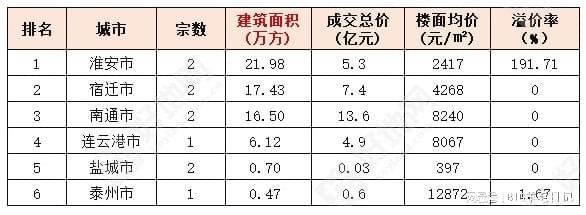 成交建面方面,淮安市以21.98万方夺得冠军;宿迁市和南通市分列二、三位,成交建面分别为17.43、16.5万方。