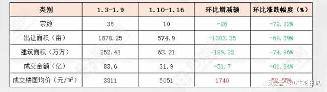 环比上周,宗数减少26宗,降幅72.22%;总成交建面减少189.22万方,降幅74.96%;总出让金减少51.7亿元,降幅61.84%。